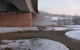 Der Überbau der Spannbetonbrücke besteht aus zwei in Längs- und Querrichtung vorgespannten Hohlkästen. Hierzu wird die Brücke durch Überfahren mit einem Gewichtsfahrzeug (LKW) belastet. Die beiden äußeren Felder verfügen über eine Spannweite von 85 m, das mittlere Feld ist über 140 m gespannt. Im Rahmen der Prüfung war die Vertikalverformung der mittleren Felder zu kontinuierlich zu messen.